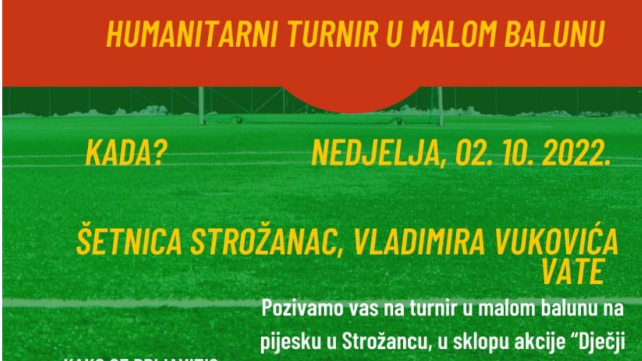 U sklopu humanitarne akcije “Dječji koraci” počele su prijave za turnir u malome balunu na pijesku, koji će se održati u nedjelju, 2. listopada na šetnici Strožanac. Sve informacije mogu se dobiti kod Andrije Stipanovića, predsjednika udruge Vjeruj i Djeluj na broj mobitela 095 537 8334. Prijave su do 30. rujna. Igra se s tri igrača plus jedna rezerva, kotizacija je 400 kuna.