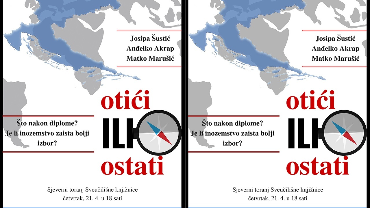 Centar za savjetovanje studenata Sveučilišta u Splitu, Savjetovalište za upravljanje karijerama organizira javnu tribinu: “Otići ili ostati?” koja će se održati u četvrtak, 21. 4. s početkom u 18 sati u Sjevernom tornju Sveučilišne knjižnice.
