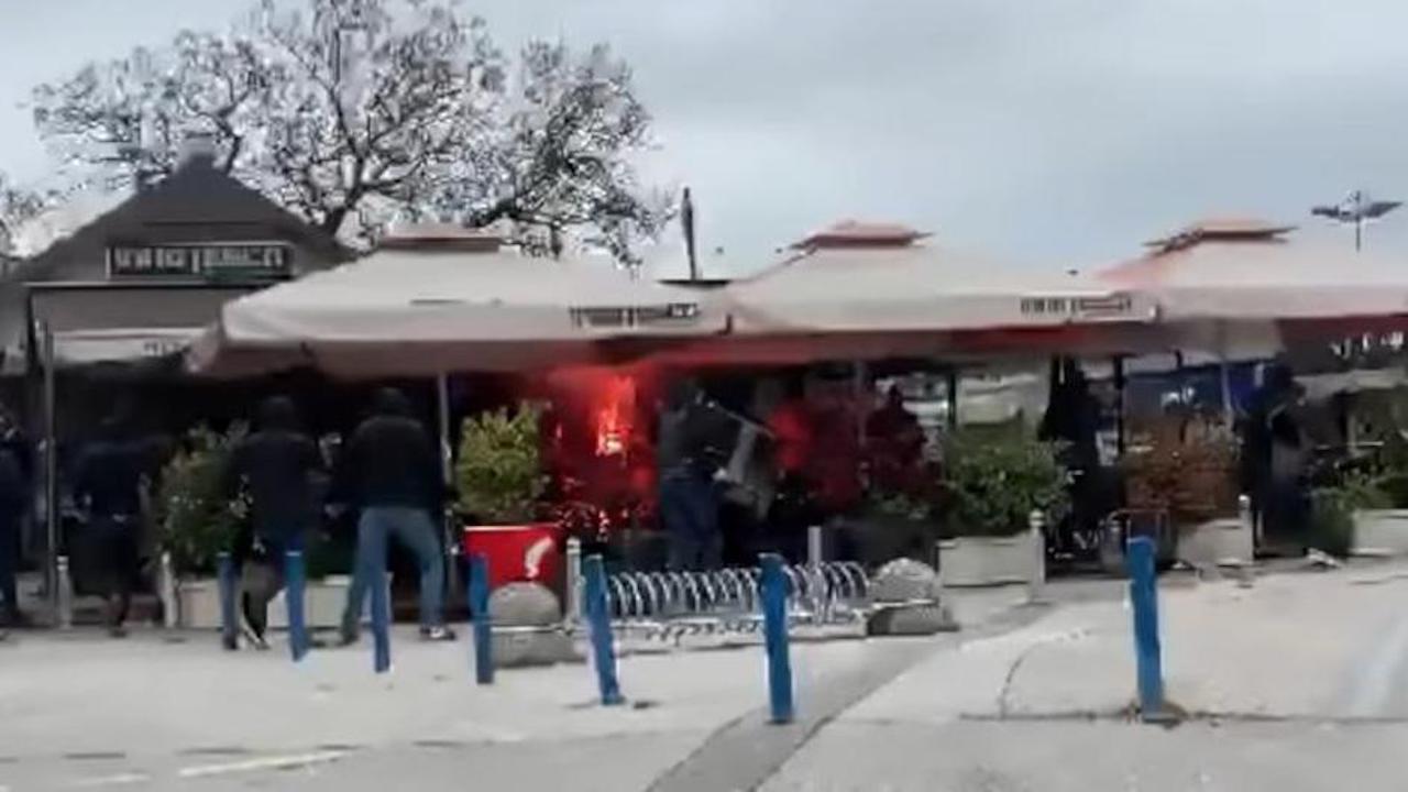 Letjeli su stolovi i stolice iz obližnjih kafića, a u jednom trenutku netko je zapalio i baklju. Policija je objavila kako su se potukli navijači.