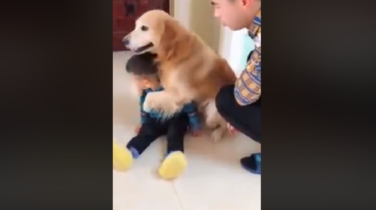 Video prikazuje labradora koji u namjeri da zaštiti dječaka od vikanja njegovog oca, grli dječaka i pomiče ga u stranu.