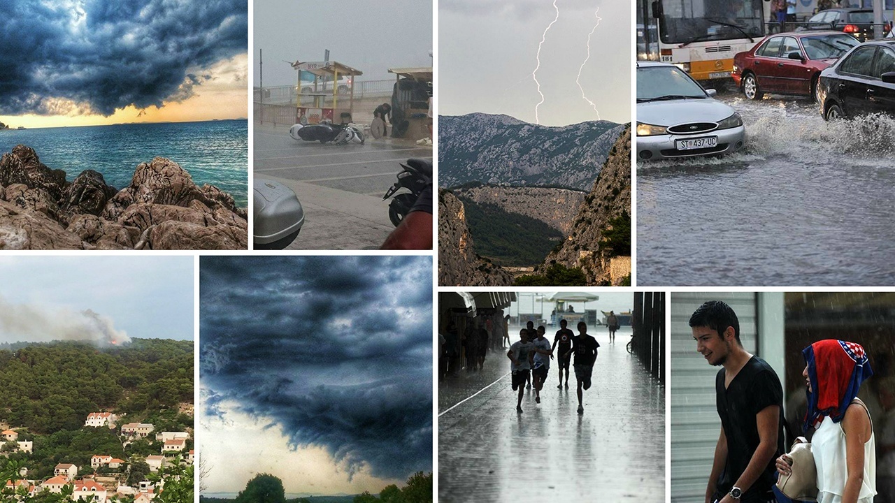 Stablino vrijeme u Dalmaciji počelo se narušavati protekle noći kada su grmljavinski pljuskovi zahvatili dio južne Dalmacije. Tijekom jutra grmljavina se proširila na makarsko i omiško područje, međutim, jače nevrijeme počelo je iza 16 sati; prvo u zagori srednje Dalmacije, a uskoro na širem splitskom i šibenskom području. Lokalno je bilo jakih grmljavinskih pljuskova, na Vidovoj gori i zaleđu Šibenika i tuče, a sve je bilo praćeno jakim padom temperature zraka i prolazno, vrlo jakim udarima vjetra. Primjerice, na crometeo postaji Sinj Pavići temperatura je pala sa 35 na 19 stupnjeva u razmaku od 90 minuta. Slično je bilo i na splitskom području – u Splitu je temperatura pala sa 31 na 22 stupnja u sat vremena, a u Kaštelima u istom razdoblju sa 34 na 22 stupnja.