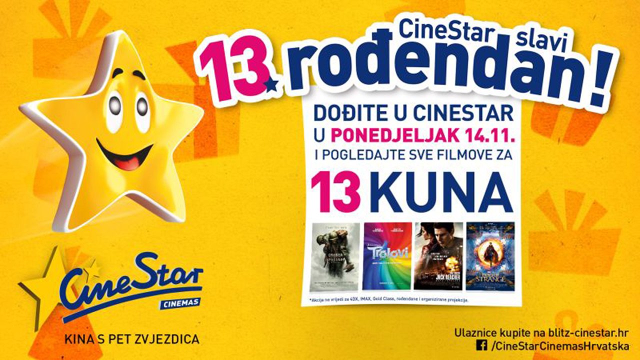 Proslava rođendana zasigurno je jedan od najveselijih dana u godini, a kako CineStar ove godine slavi 13. rođendan, svoje vjerne filmoljupce odlučio je razveseliti i pritom počastiti jednom zaista posebnom poslasticom! Naime, u ponedjeljak, 14.11., sve filmove ćete moći pogledati za prigodnu cijenu od samo 13 kuna! Ova specijalna rođendanska proslava postala je već tradicionalna u CineStar kinima koju na taj dan budu ispunjena do posljednjeg mjesta. Tog dana imat ćete priliku pogledati najnovije filmske hitove poput primjerice animiranog hita ”Trolovi”, Marvelovog briljantnog super junaka ”Doktor Strange”, hrvatsku komediju ”Ministarstvo ljubavi”, ratnu dramu snimljenu prema nevjerovatnoj istinitoj priči redatelja Mel Gibsona ”Greben Spašenih” i akcijsku avanturu s Tom Cruisom ”Jack Reacher: Nema Povratka” te mnogi drugi.