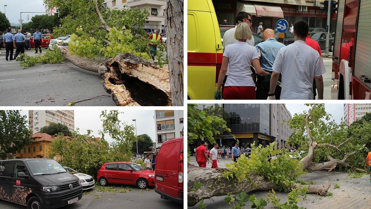 Zbog jakih udara juga u centru Splita, oko 12.30 sati na križanju ulica Domovinskog rata i Hrvatske mornarice srušeno je 50 godina staro stablo. Prava je sreća da nije bilo ozbiljnijih posljedica. Oštećena su dva automobila, od čega jedno službeno policijsko vozilo (jedan policajac zatražio je liječničku pomoć, a prema prvim informacijama lakše je ozlijeđen).