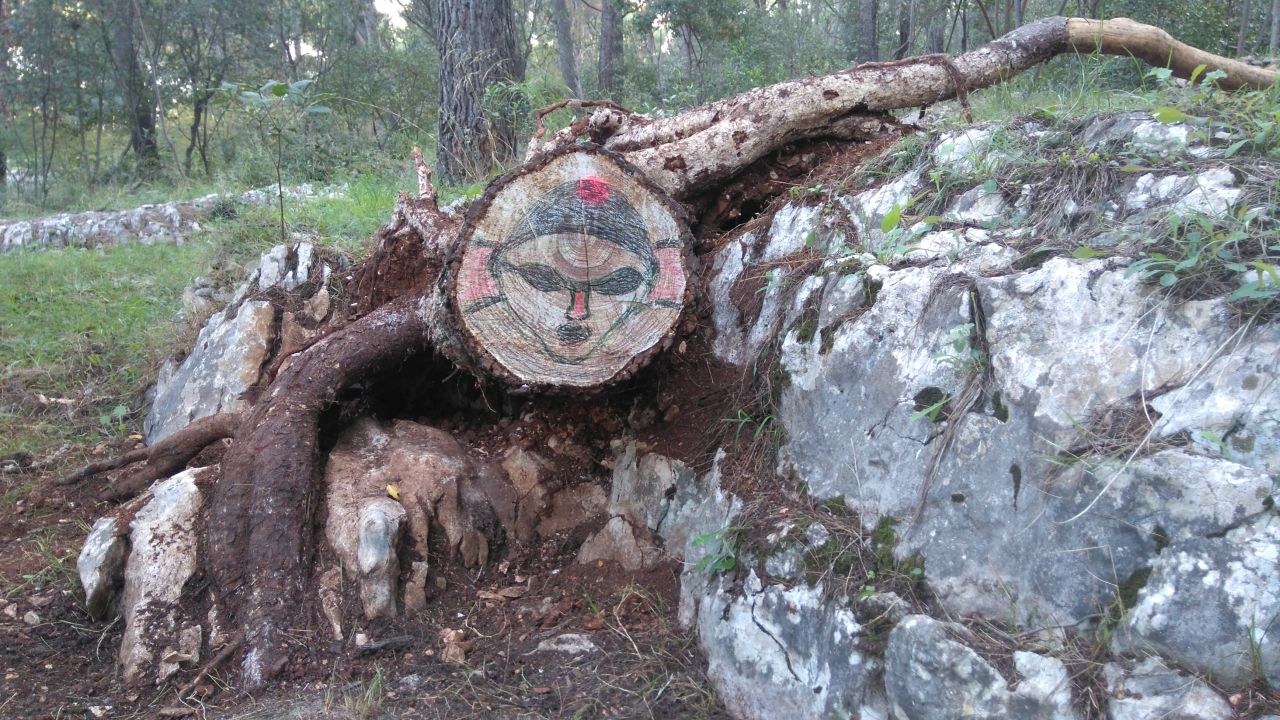 Očito da među posjetiteljima Marjana ima i likovnjaka kojima je od bure oboreni bor postao zanimljiv izgledom svojih neuobičajenih korjena nalikujući na plivača koji pliva leptirovim stilom, pa su vjerojatno priručnim alatom (flomasterima) nacrtali glavu plivača koji pliva butterfly punom brzinom hvatajući more svojim snažnim rukama (korijenjem).