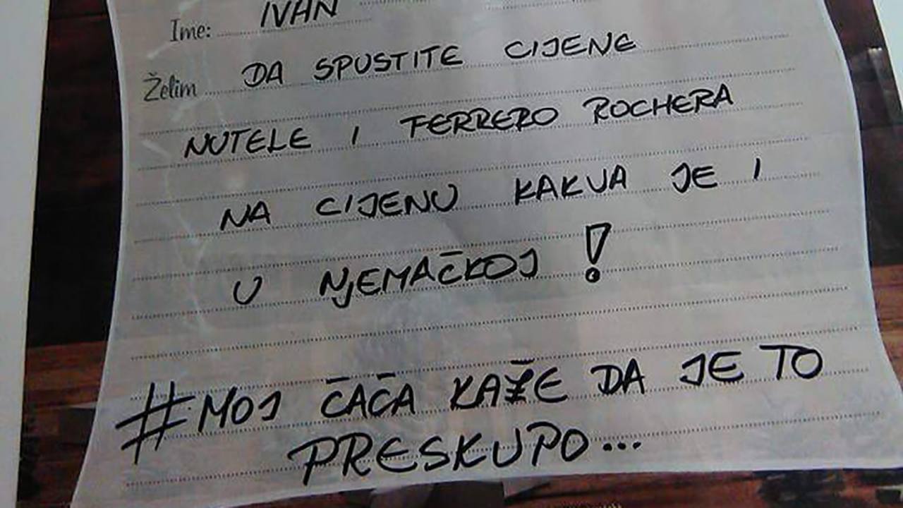 Blagdani se bliže, a s njima i vrijeme darivanja. Na društvenim mrežama se pojavila fotografija jednog pisma Ivana iz Vinkovaca, kojemu je blagdanska želja da su cijene Nutelle i Ferrero Rochera u hrvatskim trgovinama kao i u njemačkim trgovinama.