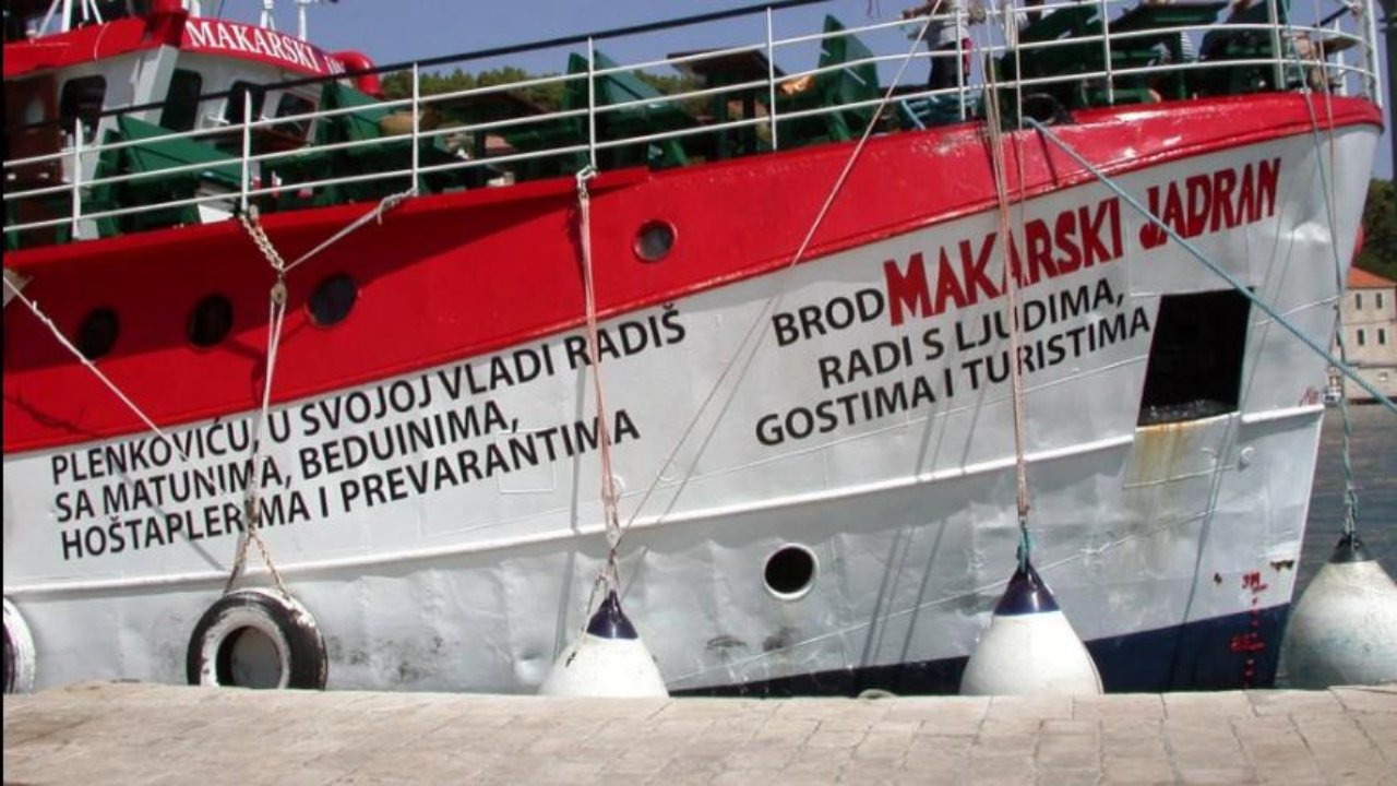 Na stotine njih je mobitelima i objektivima svojih kamera zabilježilo veliki natpis na pramčanom dijelu ovog inače atraktivnog broda na kojem piše “Plenkoviću, u svojoj vladi radiš s matunima, beduinima, hohštaplerima i prevarantima. Brod ‘Makarski Jadran’ radi s ljudima, gostima i turistima”.