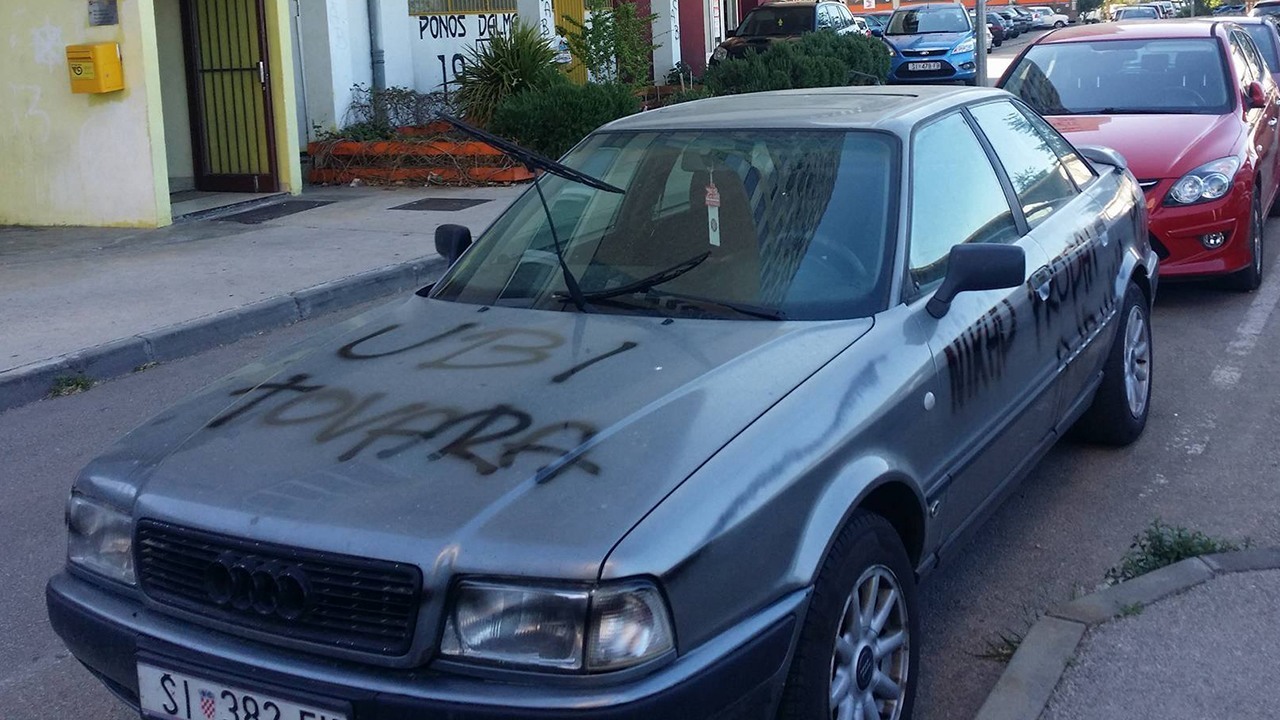 U Šibeniku, točnije na Baldekinu, prošlog je vikenda nepoznati počinitelj na karoseriji Audija sprejem ispisao poruke mržnje “Ubi tovara” i “Nikad prodat Ajduku”.