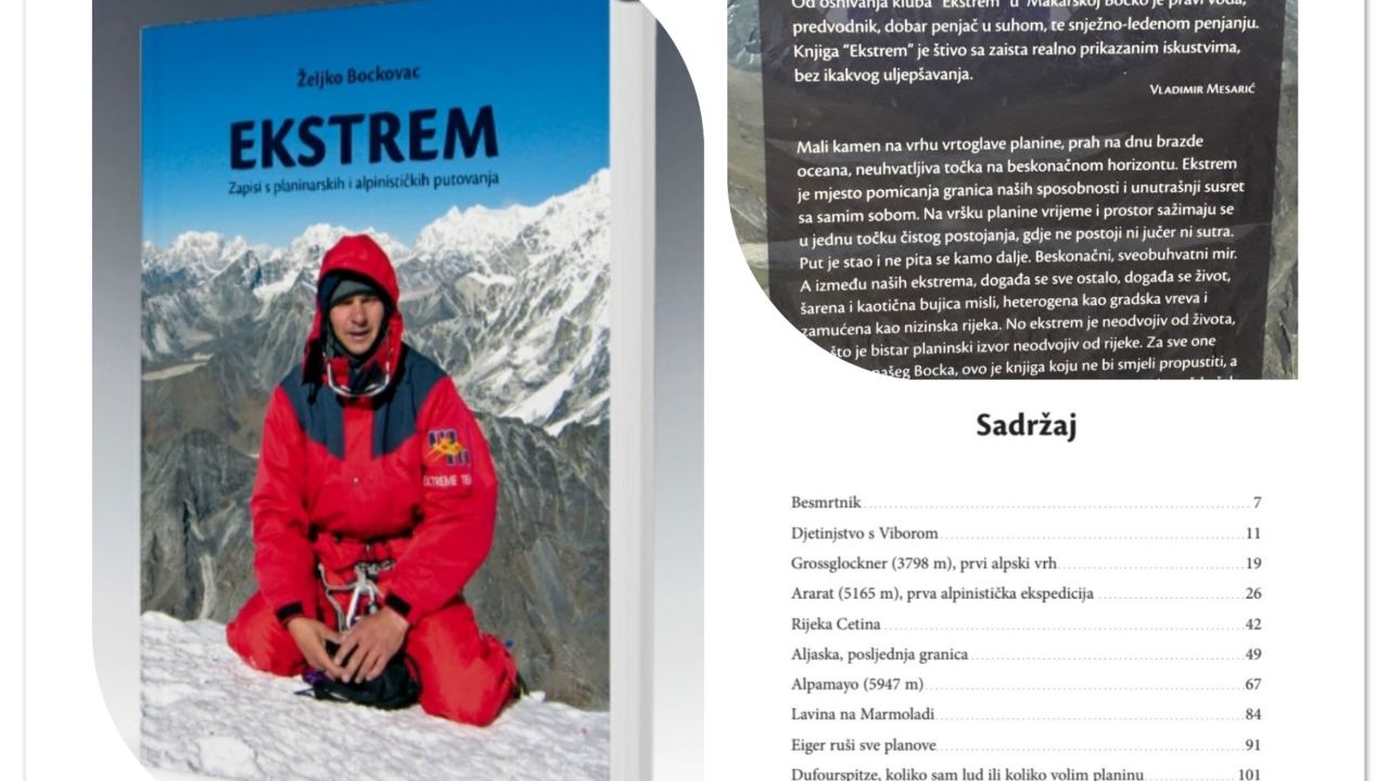 “Ekstrem – zapisi s planinarskih i alpinističkih putovanja”, autora Željka Bockovca – Bocka, našeg dugogodišnjeg člana, instruktora u visokogorskoj školi i nekadašnjeg voditelja alpinističke škole.