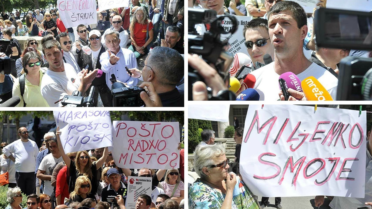 I dok su vijećnici raspravljali u vijećnici, prosvjednici su pred prozorom zviždali. Naoružali su se i transparentima, a na nekima od njih stoji “Marasoviću, pošto kiosk?”, “pošto radno misto?”…