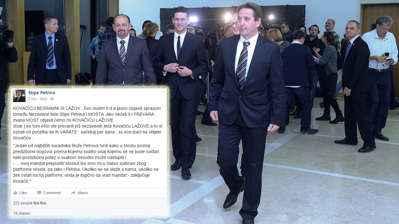 Pošto je zastupnik Mosta i omiški gradonačelnik Ivan Kovačić na poslijepodnevnoj konferenciji za novinare rekao kako ga je Petrina nagovarao da podupre SDP, pri čemu ga je optužio da napada Most i laže u svojim izjavama, Petrina ga je preko Facebooka nazvao “najvećim razočaranjem” i “lažovom bez premca”, ustvrdivši kako je riječ o prijevari birača.