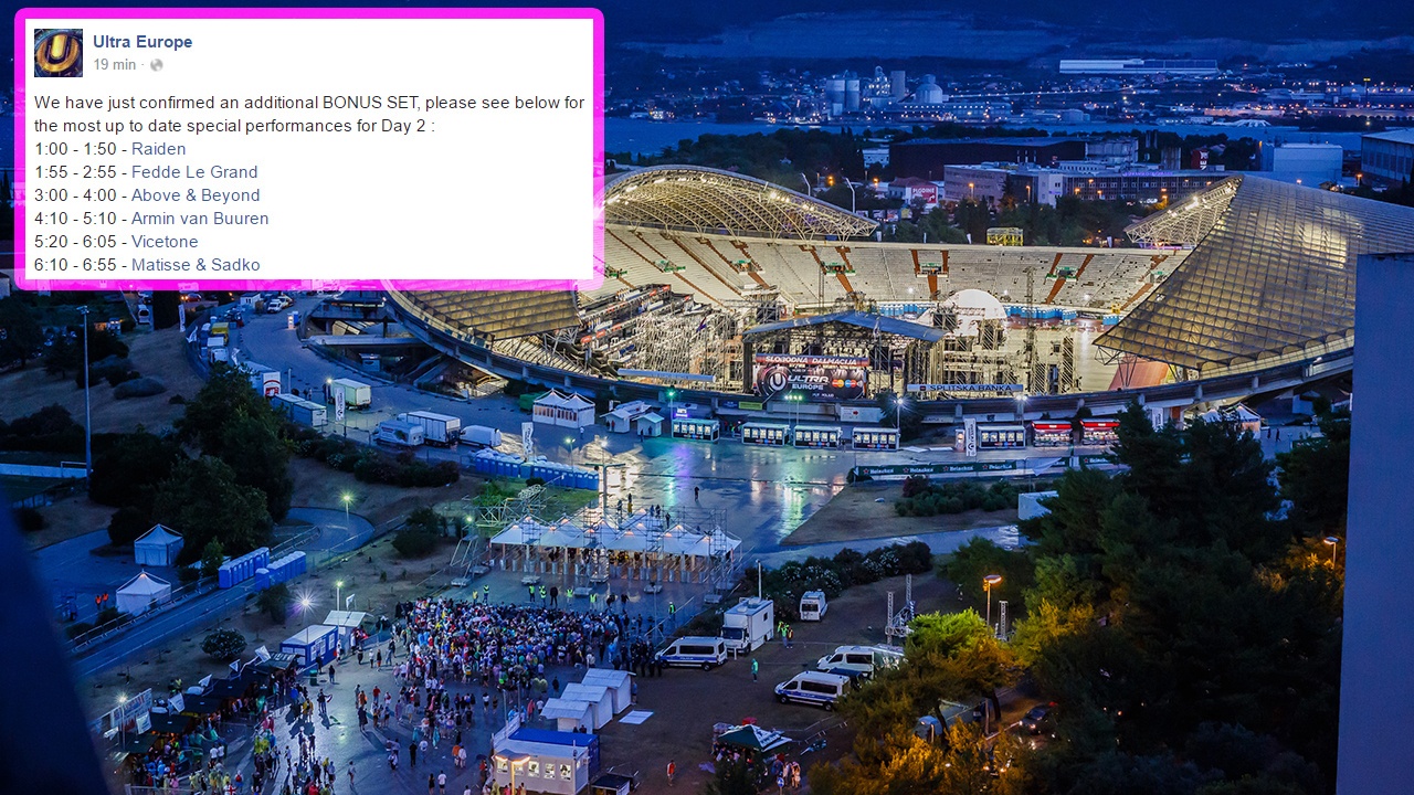 Ultra Europe festival će svoj program danas započeti već u podne kada se očekuju nastupi DJ-evi koji su trebali nastupiti sinoć. Među njima je Armin Van Buuren, Solomun, Alesso i Above &, Beyond, Carlcox, David Guetta, Marco Carola, DJ Snake, Adam Beyer, Afrojack, Nero, Deadmau5, Martin Garrix i mnogi drugi.
