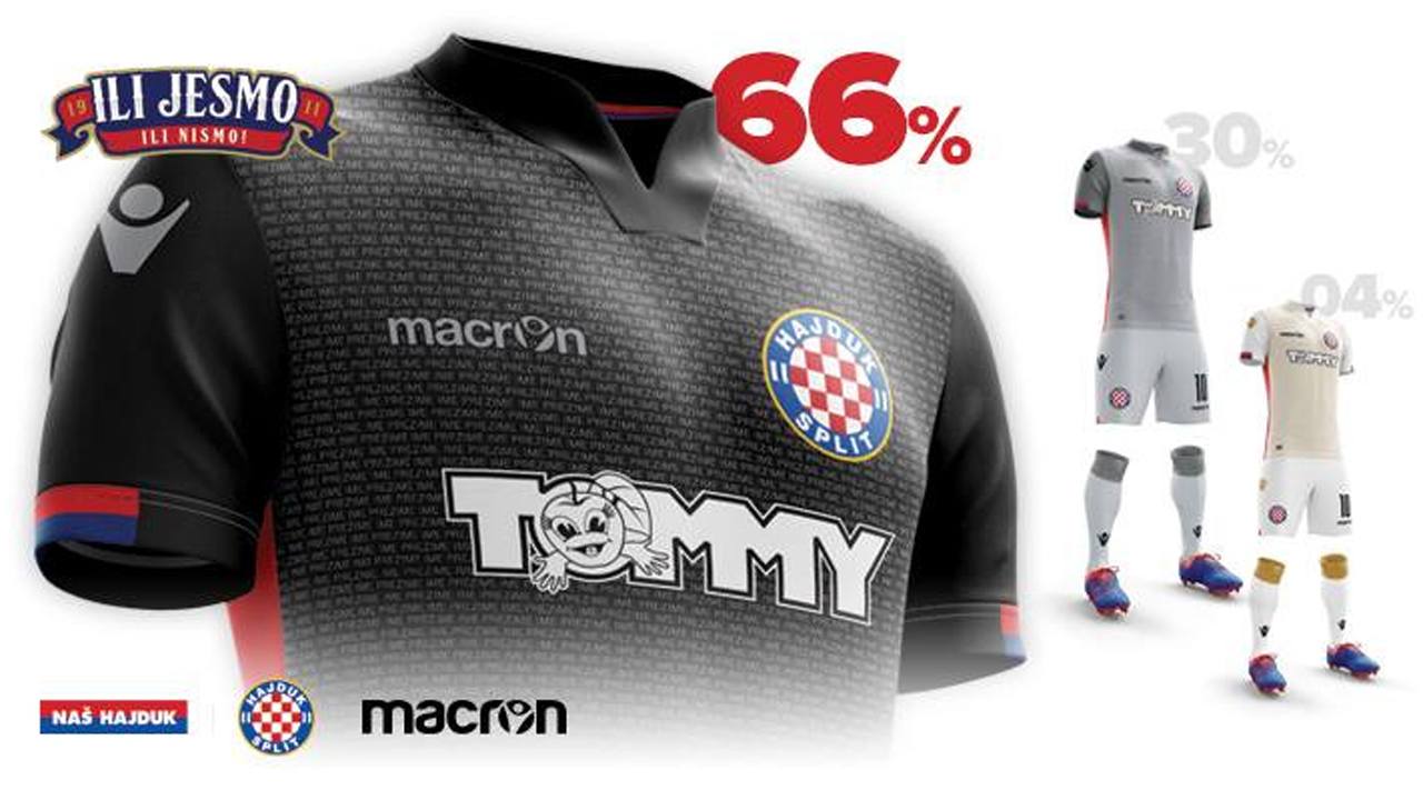 Danas je službeno izabran revolucionarni treći dres Hajduka. Navijači koji su donirali u akciji Našeg Hajduka “Ili jesmo ili nismo” izabrali su crnu varijantu od tri ponuđene. U ponudi su bile siva i bijela varijanta koje su skupile 30 % i 4 % glasova navijača. Pobjednički dres skupio je 60 % glasova, a krasit će ga i 2000 imena donatora iz akcije “Ili jesmo, ili nismo”.