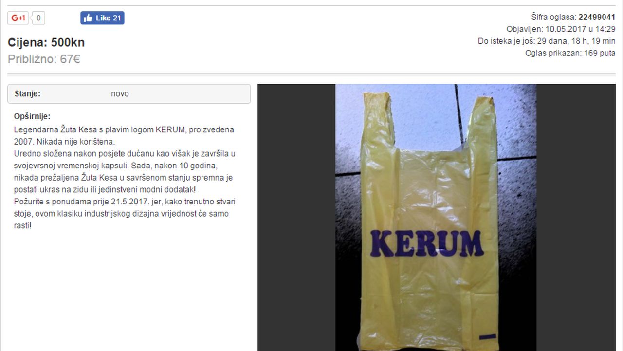 Svi znamo da na poznatom web oglasniku Njuškalo.hr ima “svake sriće”. Ovog puta osvanuo je genijalni oglas u kojem oglašivač prodaje “žutu kesu s plavim logom Kerum, proizvedenu 2007. godine, nikad korištenu”.