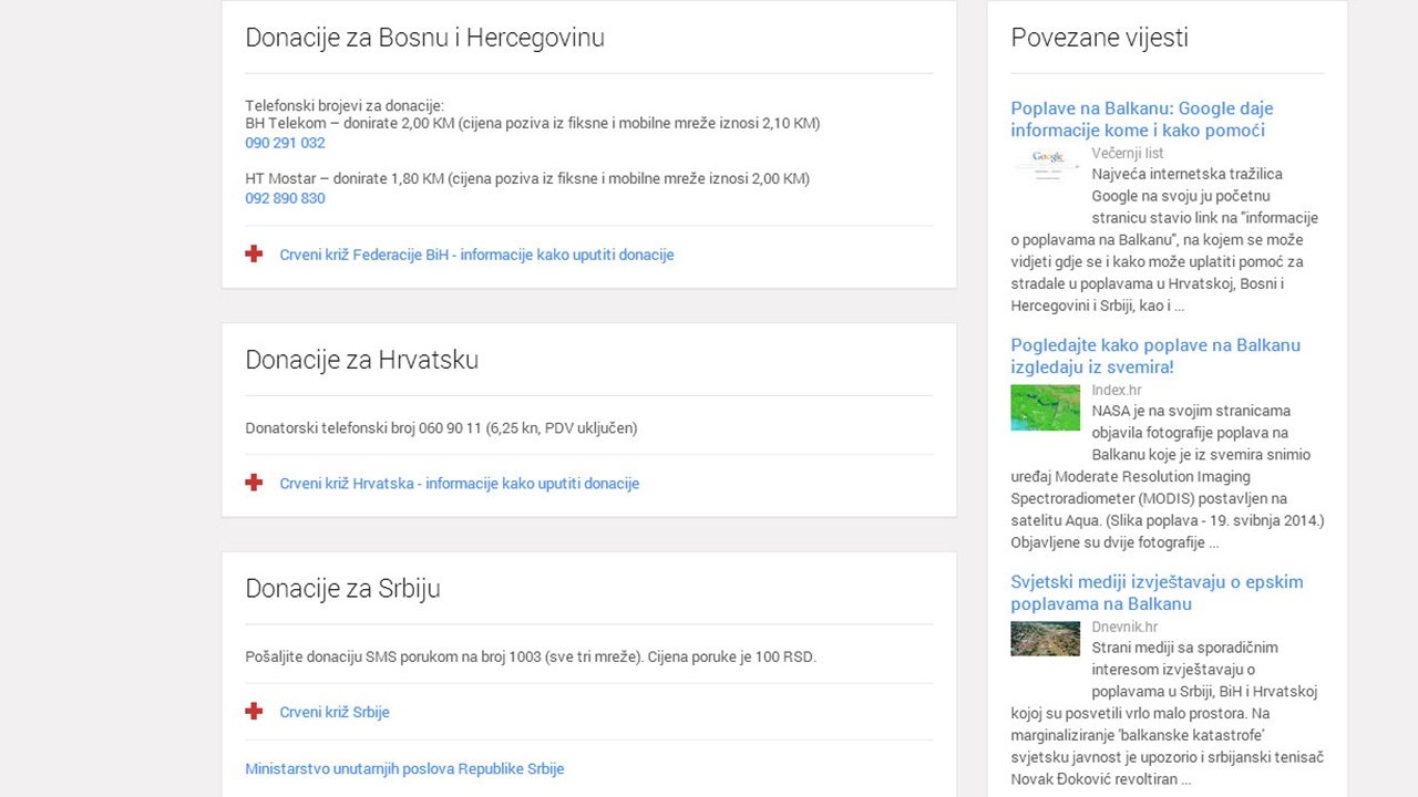 Poveznica vodi na Googleov krizni centar, odnosno stranicu posvećenu upravo katastrofi koja je zadesila Balkan, gdje se mogu pronaći ključne informacije o poplavama u regiji, uključujući i podatke o načinima doniranja, ključnim telefonskim brojevima te najnovijim vijestima. Poveznica je dodana samo na regionalne verzije ovog pretraživača, a nadamo se da ćemo nešto slično uskoro vidjeti i šire, piše Netokracija.