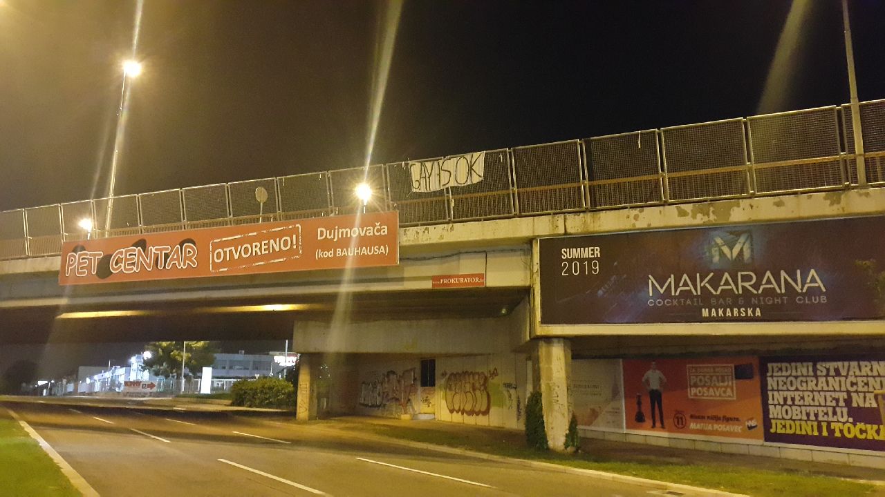 Jedan transparent s natpisom LGBT prava su ljudska prava, pojavio se na nadvožnjaku na Dubrovačkoj ulici, a drugi isto na nadvožnjaku na Ulici Domovinskog rata s natpisom Gay is OK.