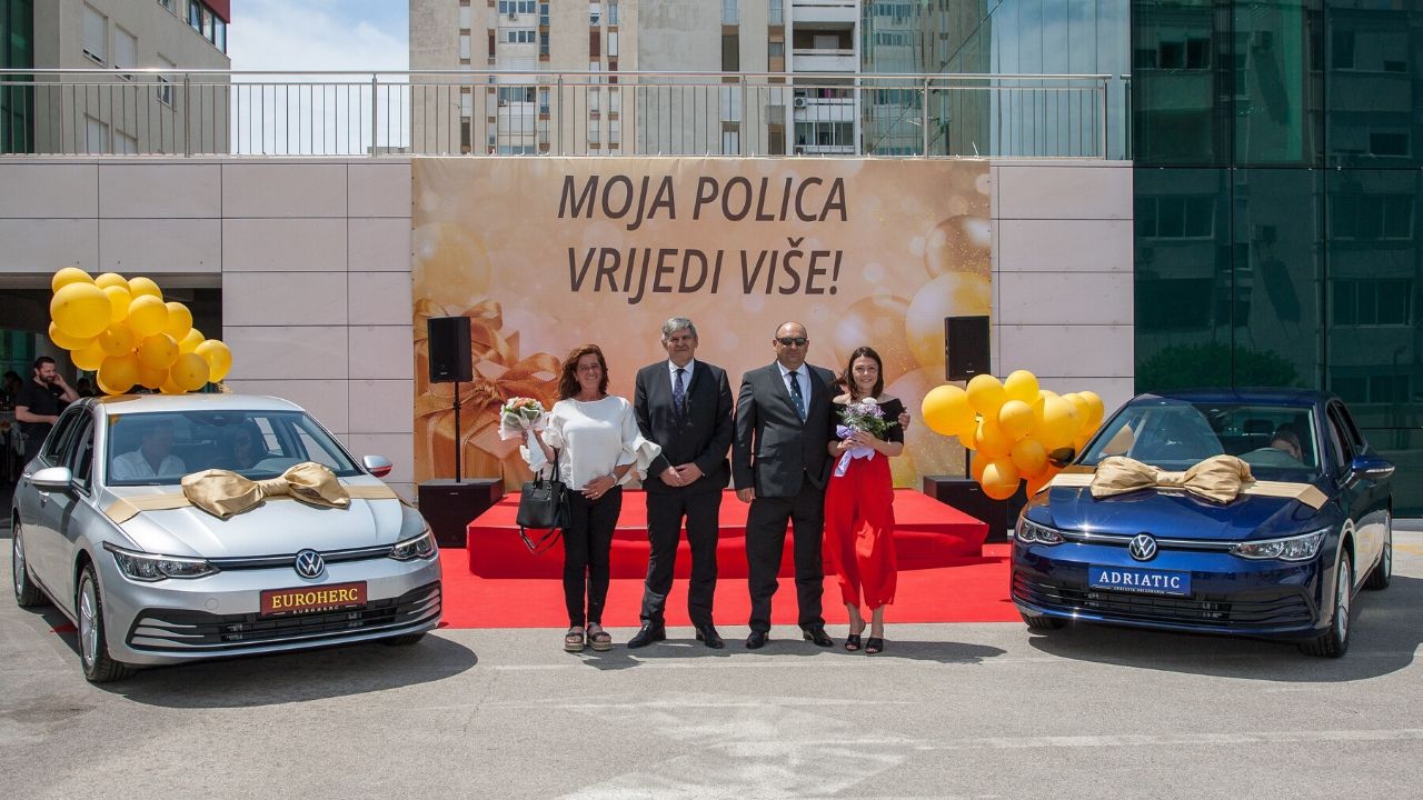 U pet hrvatskih gradova, Osijeku, Varaždinu, Rijeci, Splitu i Zagrebu, Euroherc i Adriatic osiguranje podijelit će 10 automobila Golf 8 i 100 novčanih nagrada dobitnicima prvog kola nagradnih igara ‘Moja polica u Eurohercu/Adriaticu vrijedi više’, u kojima su sudjelovali svi osiguranici, fizičke osobe, koji su od 15. veljače do 30. travnja ugovorili policu osiguranja od autoodgovornosti i/ili kasko osiguranja za svoje vozilo.