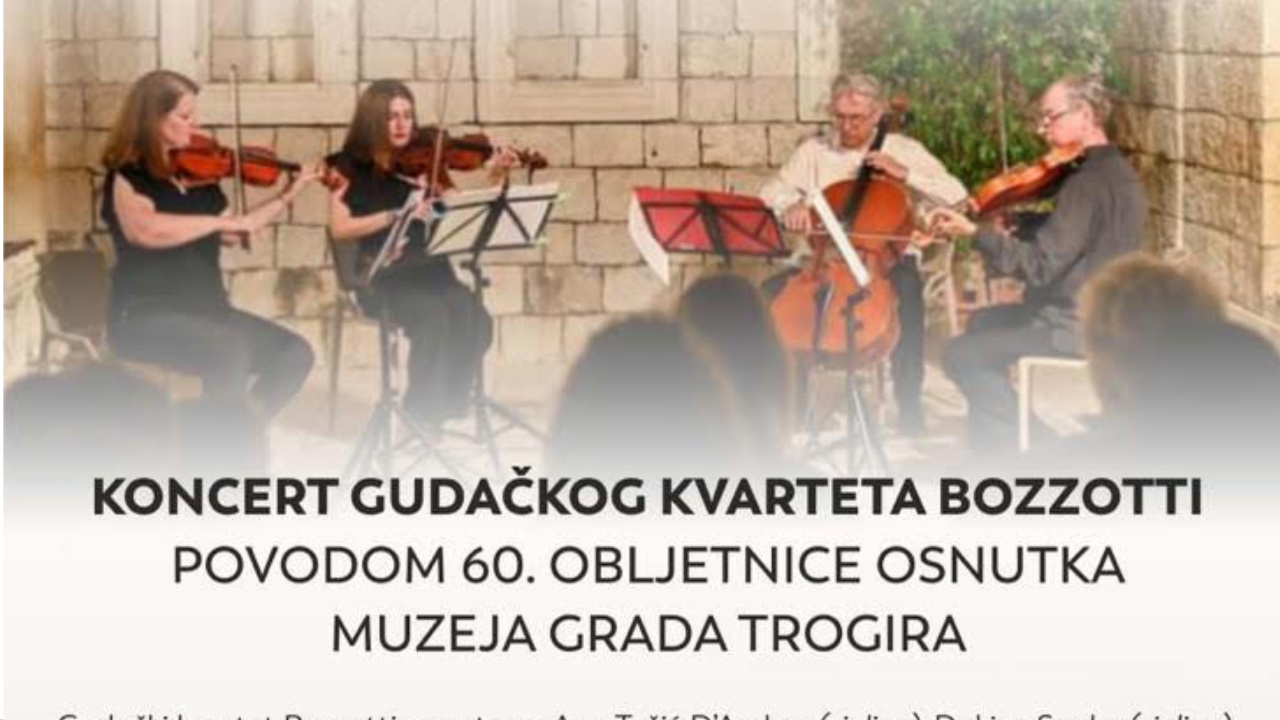 Proslavu 60. obljetnice Muzeja grada Trogira uveličat će i Trogirski Glazbenici! S radošću vas pozivamo da nam se pridružite u dvorištu Muzeja grada Trogira na koncertu gudačkog kvarteta Bozzotti koji će se održati u srijedu, 20. rujna 2023. u 20:30. Ulaz je slobodan!