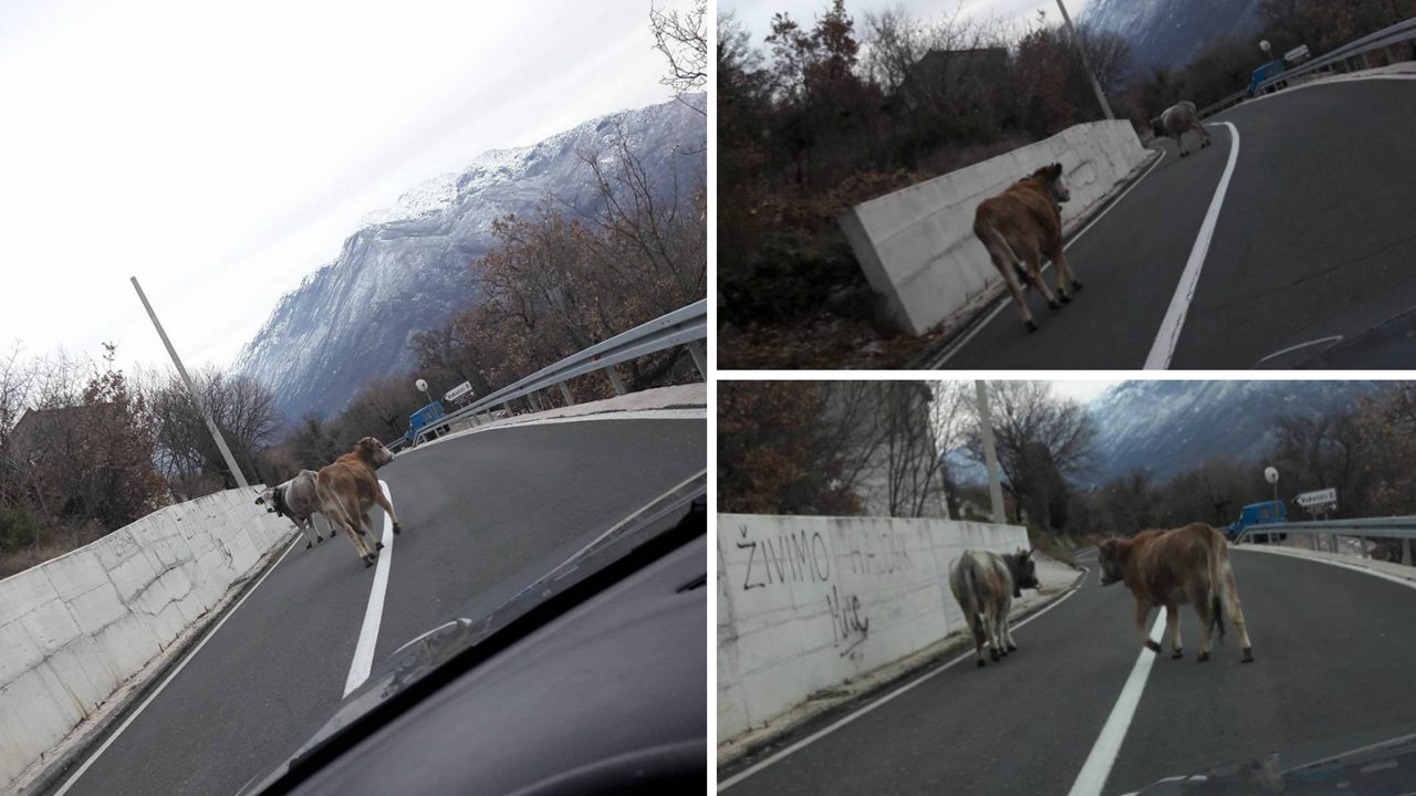 Ako se slučajno zateknete u Cisti Provo i naletite na krave na cesti, nemojte se začuditi! Upravo na dvije krave koje šetaju cestom naišao je naš čitatelj i poslao nam slike da upozori sve one koji se nađu na toj ruti.