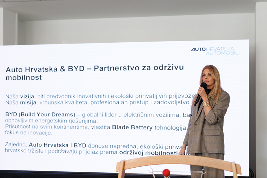 Gospođa Marija Zagorec, voditeljica marke BYD predstavila je bogatu ponudu BYD centra u Splitu te naglasila da BYD nije samo sinonim za izvrsnost u električnoj mobilnosti nego predstavila i odlične plug in hibridni modele sa dosezima preko 1080 km sa punim spremnikom goriva i baterijom. Naglasila je da će SUV segment Seal U DM-i , limuzina Seal 5 i Seal 6 koji uskoro dolazi na tržište sigurno zauzeti značajno mjesto na hrvatskom tržištu.