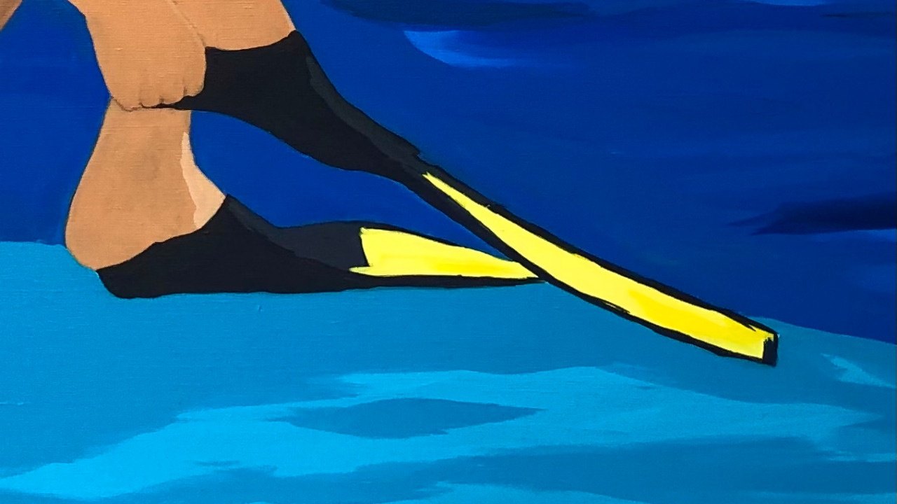 Multimedijalnost njenog izričaja vidljiva je i u ovakvim, čisto i isključivo slikarskim radovima. Statični kadar pak nagovještava pokret koji se upravo događa ili se tek treba dogoditi. Često je to, na pomalo hoknijevski način, uhvaćen trenutak “netom prije” neke akcije – skoka u more, navlačenja peraje preko pete – pri čemu gotovo kao da čujemo zvuk koji stvara guma.