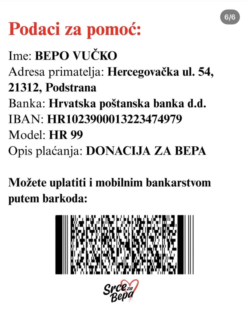 Na instagram profilu ‘Srce za Bepa’ na kojem je pokrenuta humanitarna akcija, opisuju njegov put borbe. Na početku ga je, kažu, odveo u Zagreb, gdje je operirao nadlaktičnu kost desne ruke i dobio ugrađenu endoprotezu. Nakon odrađene terapije, liječenje se nastavlja u Splitu, gdje Bepo i danas hrabro prolazi sve faze terapije.