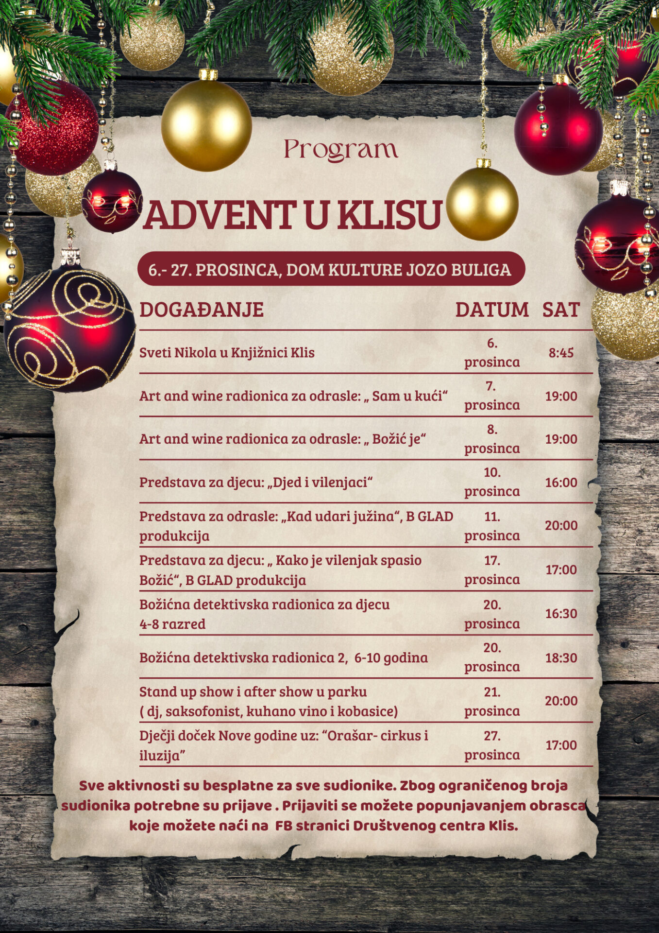 Pozivamo sve zainteresirane da se pridruže ovim događanjima te rezerviraju svoje mjesto kako bi uživali u besplatnom i raznovrsnom adventskom programu.