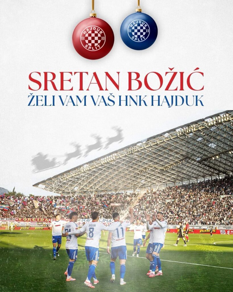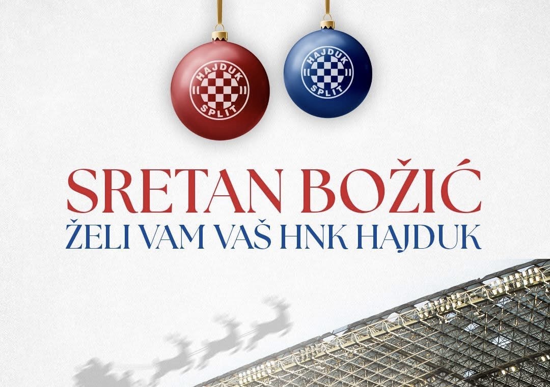 Nogometni klub Hajduk uputio je božićnu čestitku svojim navijačima, članovima i svima koji klub nose u srcu, podsjetivši još jednom na vrijednosti zajedništva, obitelji i ljubavi koje povezuju hajdučku obitelj.