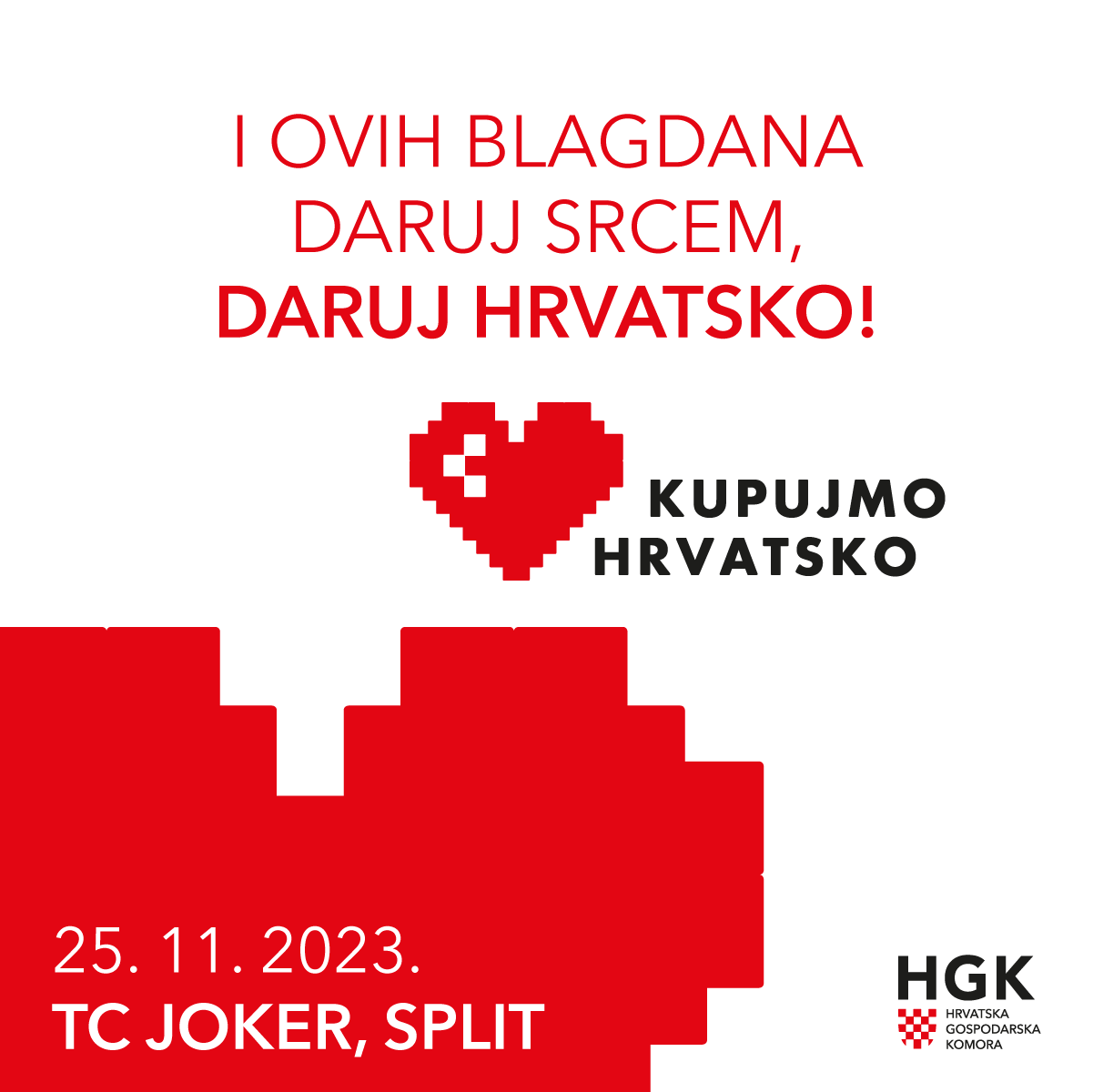 Hrvatska gospodarska komora Županijske komore Split priređuje tradicionalnu akciju pod nazivom “Darujmo Hrvatsko”, koja će se održati u subotu, 25. studenoga 2023., s početkom u 10 sati, u trgovačkom centru Joker u Splitu, prizemlje.
