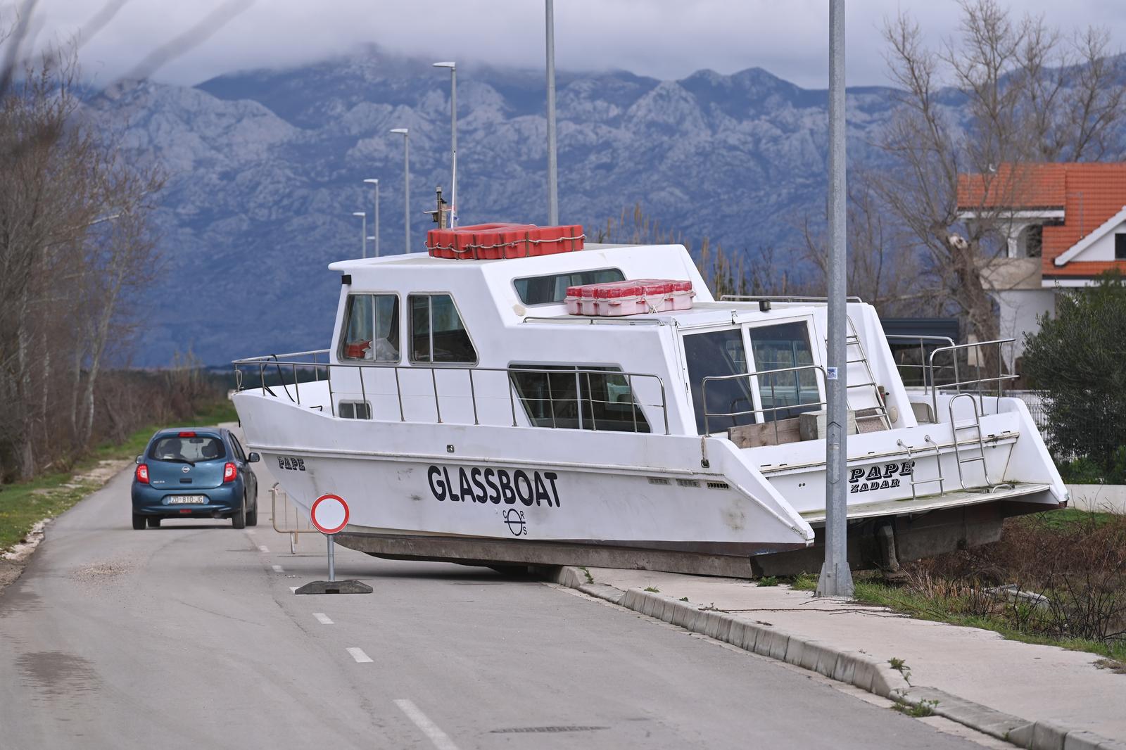 Turistički brod Pape kojeg je bujica nanijela na cestu na predjelu Ždrijac u Ninu još nije pomaknut. Velike kiše koje su pale u Zadarskoj županiji uspjele su tako nekoliko desetaka tona težak brod pomaknuti sa suhog veza te ga odnijele na cestu.