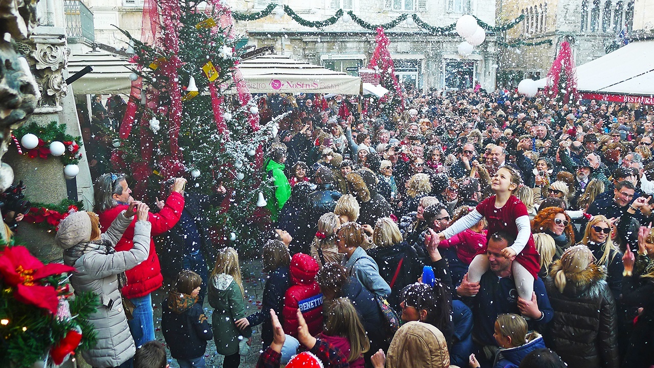 Veliki broj građana opustio se i razveselio na dnevnom dočeku na Pjaci uz umjetni snijeg. S obzirom da snježne pahulje nisu baš uobičajena pojava u Splitu, i stari i mladi nisu propustili doživljaj makar uz one umjetne.