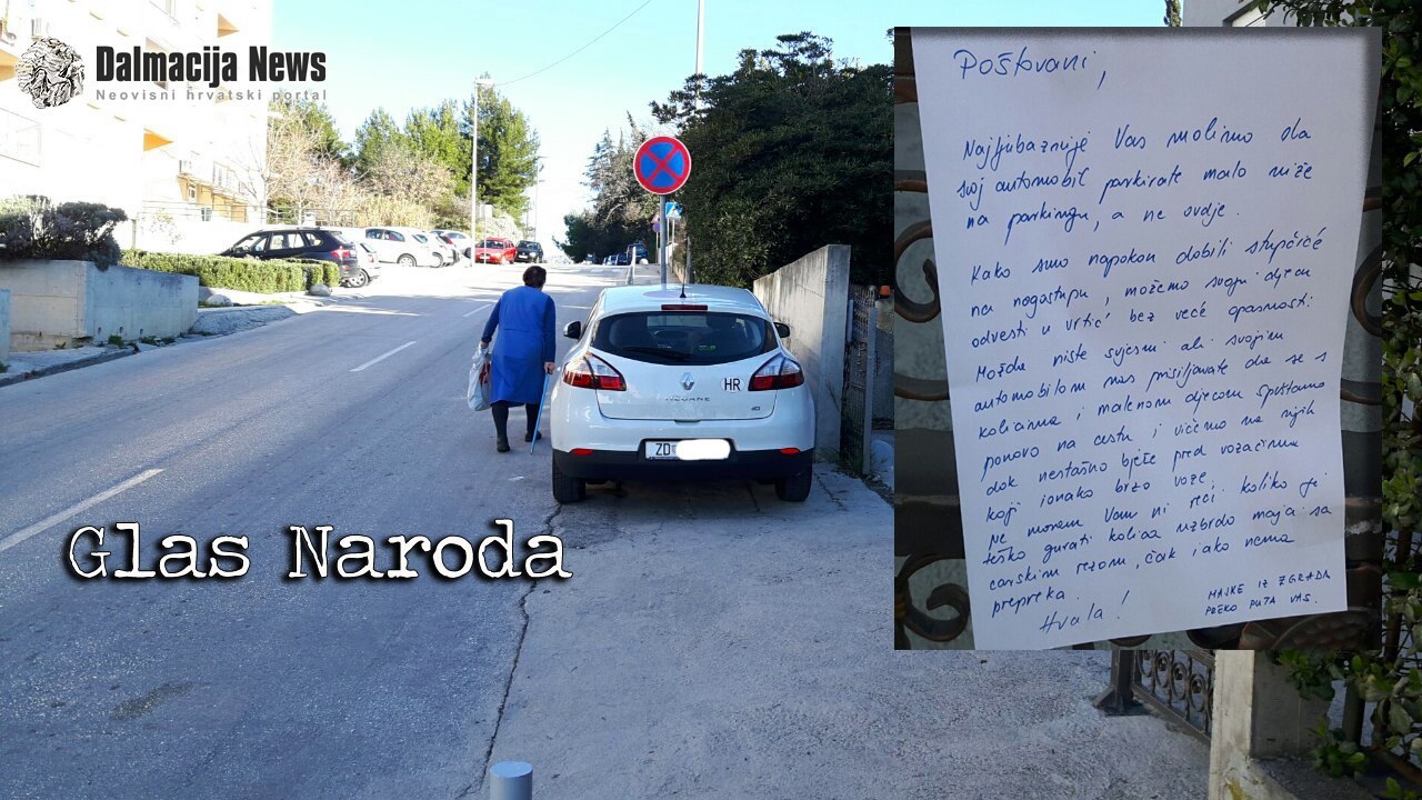– Poštovani, najljubaznije Vas molimo da svoj automobil parkirate malo niže na parkingu, a ne ovdje. Kako smo napokon dobili stupčiće na nogostupu, možemo svoju djecu odvesti u vrtić bez veće opasnosti. Možda niste svjesni ali svojim automobilom nas prisiljavate da se s kolicima i malenom djecom spuštamo ponovo na cestu i vičemo na njih dok nestašno bježe pred vozačima koji ionako brzo voze. Ne moram Vam ni reći koliko je teško gurati kolica nizbrdo majci sa carskim rezom, čak i ako nema prepreka. Hvala! Majke iz zgrade preko puta Vas – stoji u, složit ćemo se svi, krajnje ljubaznoj poruci koju su majke objesile na ogradu pored nepropisno parkiranog Renault Meganea koji se tu očito svaki dan parkira.