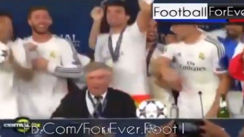 Naime, u jednom trenutku su u dvoranu uletjeli Marcelo, Sergio Ramos, Pepe, Isco, Sami Khedira i naš Luka Modrić i prekinuli izlaganje svoga trenera pjevajući jednu od najpopularnijih pjesama Realovih navijača. U prvom se trenutku činilo da je Ancelottiju neugodno, ali ipak se opustio i pridružio svojim igračima u pjesmi i lupanju po stolu. Na koncu je dobio poljubac Ramosa i Pepea prije no što je mogao nastaviti razgovarati s novinarima.