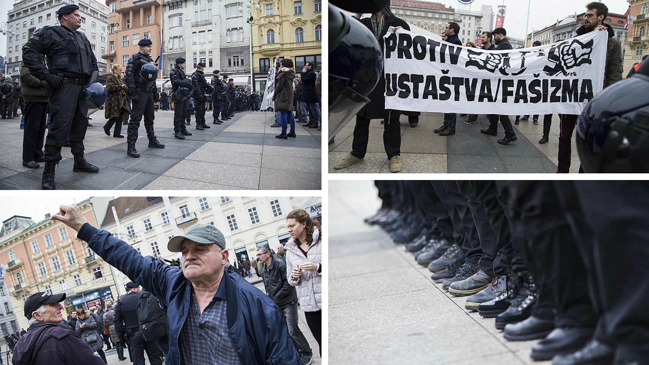 U stroju takozvanih Hrvatskih domoljubnih snaga našlo se dvadesetak ljudi odjevenih u crne uniforme, pod hrvatskom zastavom čiji grb počinje bijelim poljem. Antifašista je pak pedesetak, piše Večernji list.