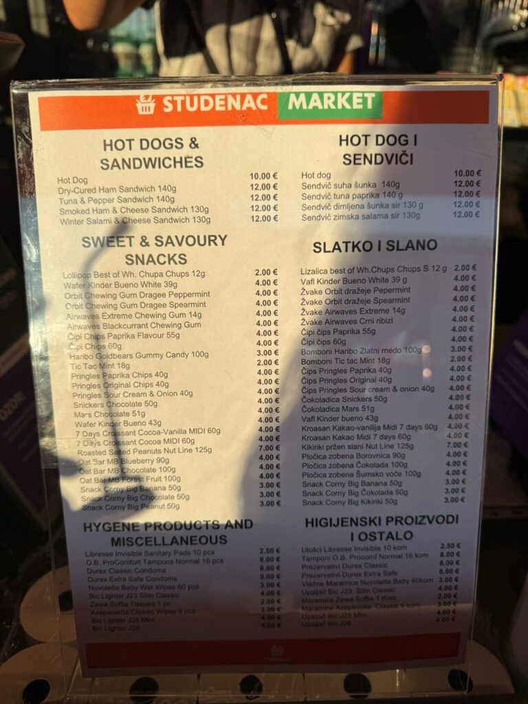 U ponudi su razne vrste sendviča i hot dogova s cijenama koje se kreću od 10 do 12 eura. Tu su i energetska pića poput Red Bulla (8 €), Coca-Cola (6 €), Jamnica, Fanta i ostali gazirani sokovi također su dostupni po cijeni od 6 eura.