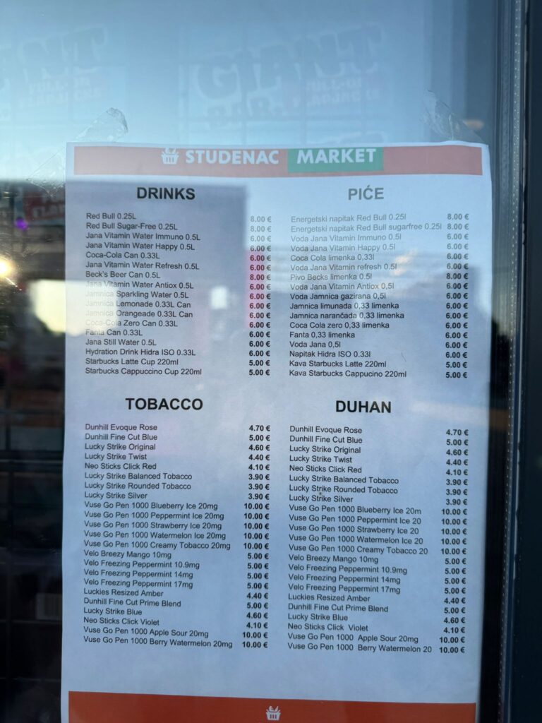 Ponuda uključuje različite brendove cigareta, e-cigarete i nikotinske vrećice s cijenama koje se uglavnom kreću između 4 i 10 eura.