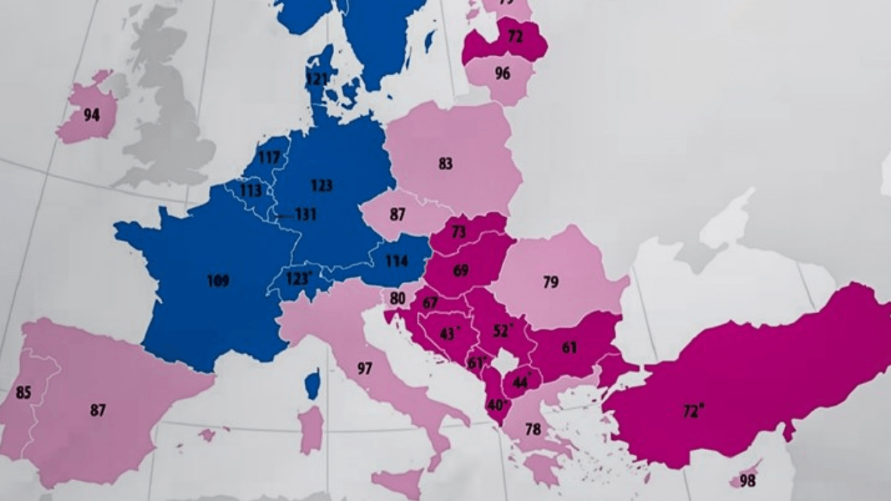 Na Cipru, u Italiji, Litvi i Irskoj razine su bile 10 posto ili manje od prosječnih, dok su Španjolska, Češka, Portugal, Malta, Poljska i Slovenija u zaostatku 11-20 posto. Rumunjska, Estonija i Grčka bile su 21-25 posto ispod prosjeka EU.