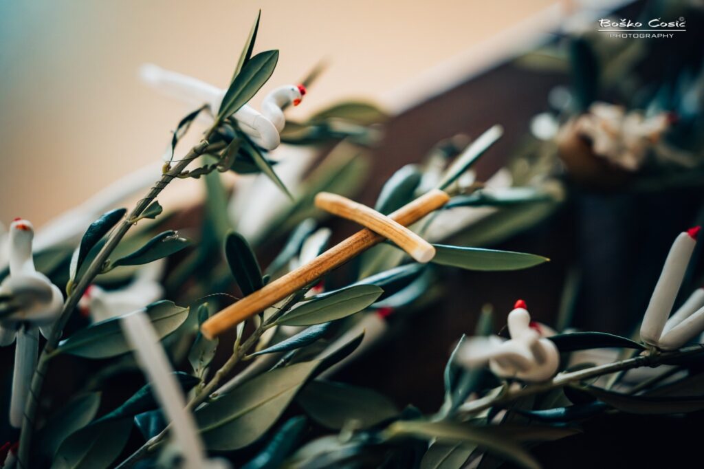 U 9 sati na Topani započela je jutarnja molitva i blagoslov maslinovih grančica ukrašenih ručno izrađenim “tičicama”. Te male figurice, izrađene od srčike mladica smokve, simboliziraju Muku Isusovu i predstavljaju prvi imotski suvenir.
