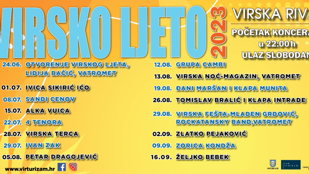Lidija Bačić Lille otvorit će u subotu 16. lipnja (22 sata) jednu od najpoznatijih ljetnih estradnih manifestacija na Jadranu, dok će 16. rujna koncertom Željka Bebeka tradicionalno Virsko ljeto 2023. biti zatvoreno. Tri mjeseca zabave, koncerta i uživanja u lakim notama na virskoj rivi upotpunit će još neki od najvećih i najpopularnijih domaćih estradnjaka, a evo kako izgleda kompletan program ovogodišnjeg Virskog ljeta: