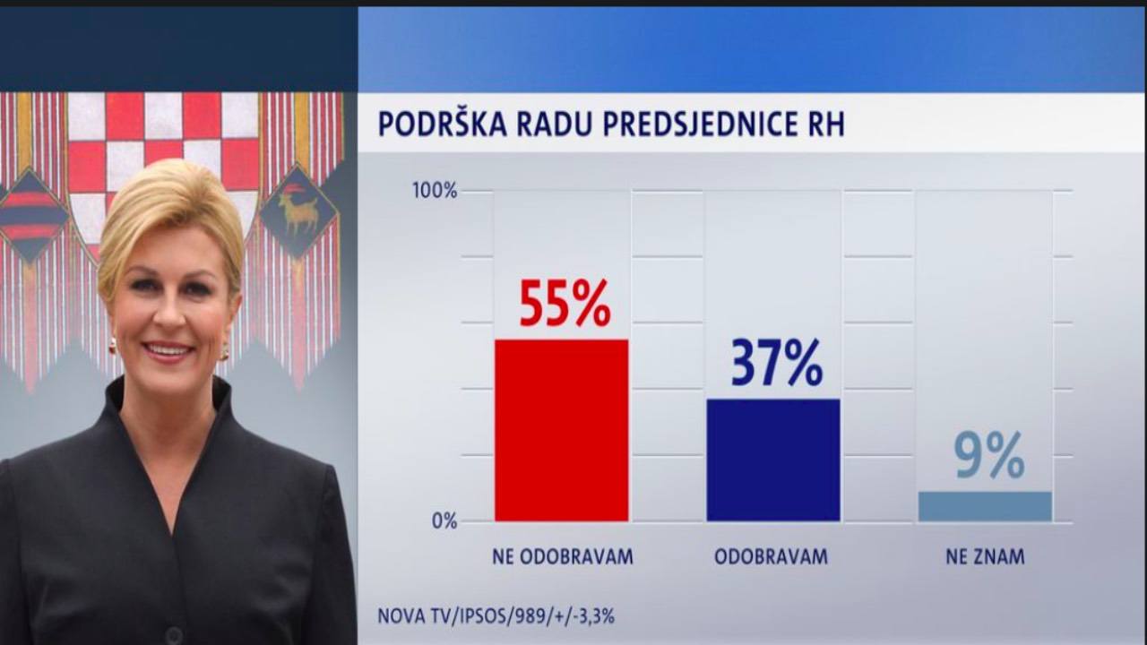 Prema istraživanju koje je agencija Ipsos provela za Novu TV pokazuje da predsjednica u posljednjih 30 dana ulazi s najmanjom potporom za svoj rad. Njezin rad ne odobrava 55 posto građana, a odobrava njih 37 posto. Ne zna 9 posto.