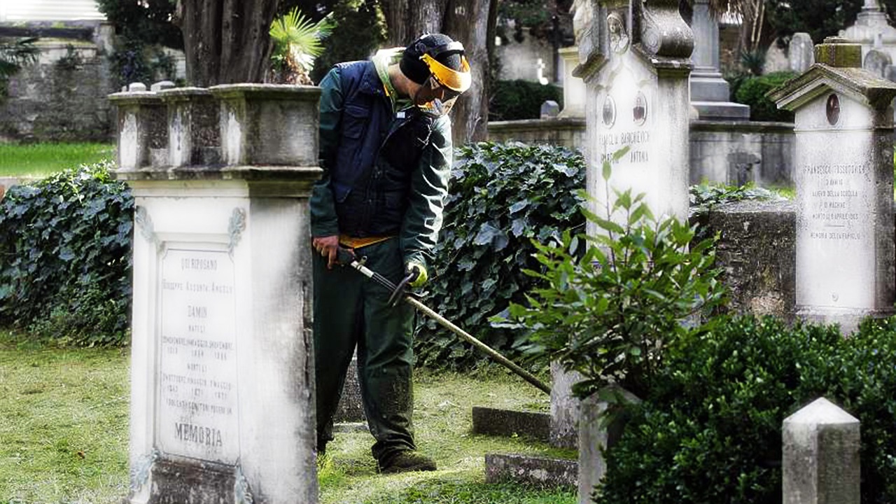 mjesnom groblju, majka opremljena zidarskom alatkom. S nadgrobne ploče su