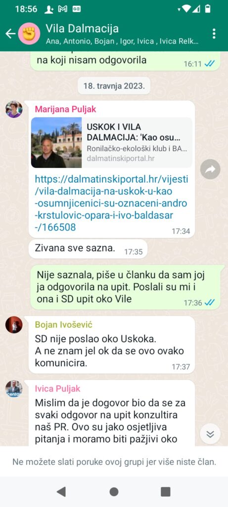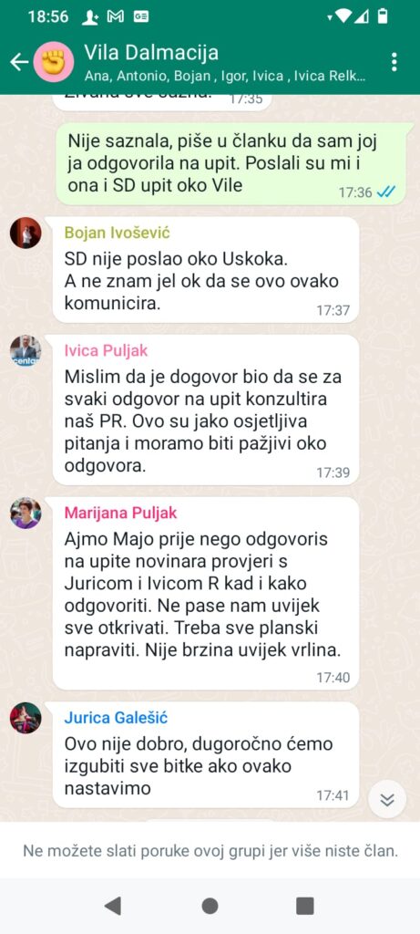 U spis u kojem se odlučuje o njezinoj suspenziji u Banovini na mjestu pročelnice za gradsku imovinu, Maja Đerek je u četvrtak na Službeničkom sudu u zgradi splitsko-dalmatinske županije priložila poruke iz zajedničke grupe na društvenoj mreži naslova “Vila Dalmacija” koja, kako nam je kazala Đerek, dokazuje da izvršnoj vlasti predvođenoj Ivicom Puljkom nije bilo sporno što s javnošću nije komunicirala preko Službe za odnose s javnošću nego PR-ovcima njegove stranke…
