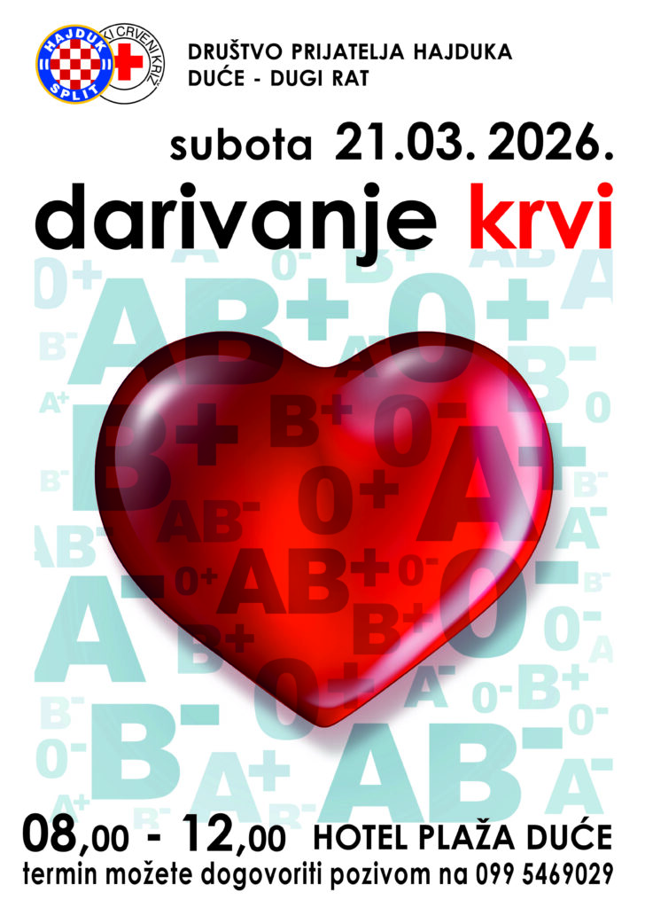 21. ožujka (subota) HCK Gradsko društvo Crvenog križa Omiš i Društvo prijatelja Hajduka Duće-Dugi Rat desetu godinu zaredom organiziraju akciju darivanja krvi.