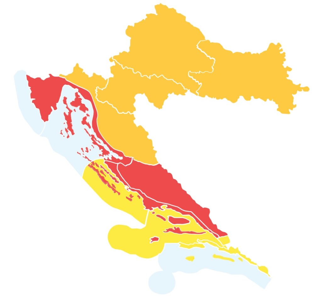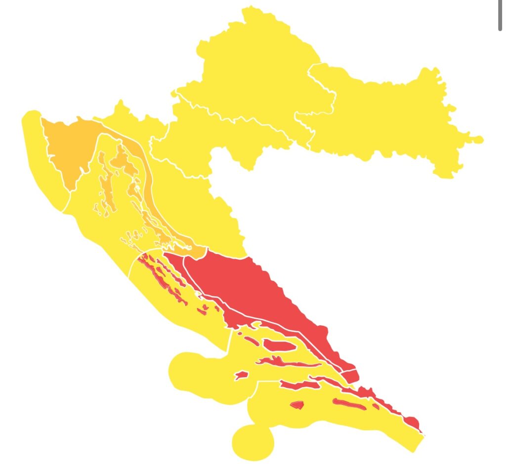 Crveno upozorenje trenutačno je na snazi za Riječku, Kninsku i Splitsku regiju, dok se nestabilno vrijeme širi i na kontinentalni dio Hrvatske.