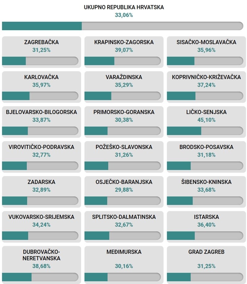 Najveći odaziv do 11:30 danas je zabilježen u Ličko-senjskoj županiji (20,93 %), dok su najniže brojke zabilježene u Brodsko-posavskoj (13,35 %) i Međimurskoj županiji (13,48 %). U Gradu Zagrebu glasovalo je 14,06 % birača.