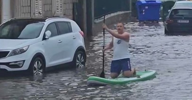 -Preko Lapadske jedino ovako, napisali su uz fotografiju na kojoj čovjek na supu vesla poplavljenom ulicom.