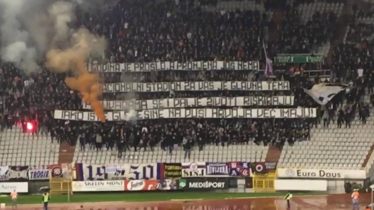 “11 godina je prošlo, a promjena još nema, nacionalni stadion za vas je glavna tema. Po livadama se i dalje životi riskiraju, iako iste glavešine na duši Hrvoja već imaju!” pisalo je na transparentu Torcide koji je izvišen oko polovice drugog dijela.