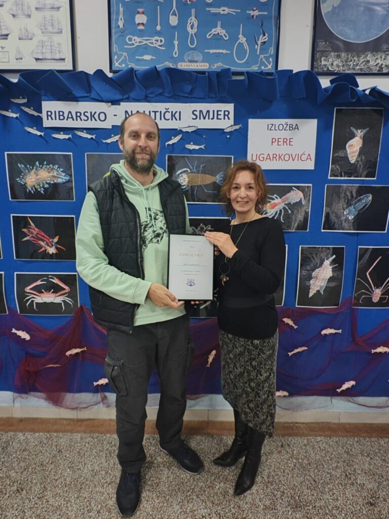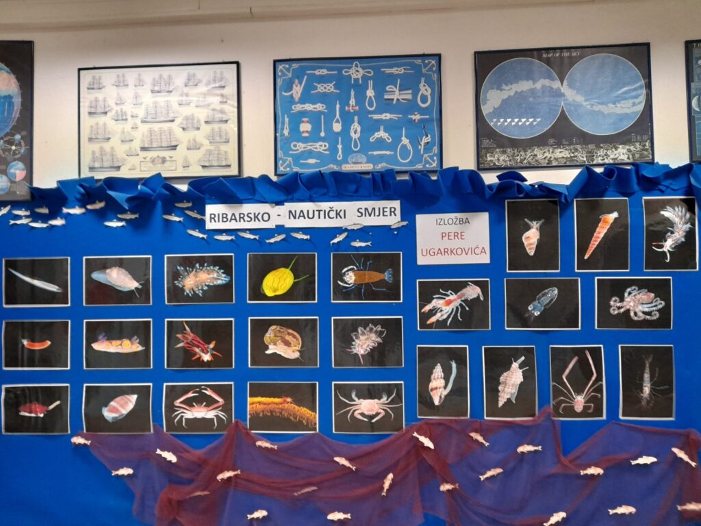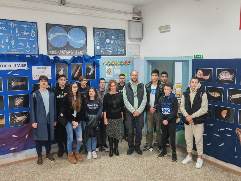U predblagdanskom tjednu učenici Pomorske škole Split imali su čast upoznati se s jedinstvenim, šarenim i iznimno značajnim podvodnim svijetom putem izložbe gospodina Pere Ugarkovića postavljene ispred knjižnice škole. Nakon svečanog otvaranja izložbe, učenici su imali priliku razgovarati s autorom o raznim vrstama životinja koje je fotografirao. Njegove prekrasne autorske fotografije prikazuju samo mali dio bogatstva oblika i boja morskih bića koje je gospodin Ugarković prikupljao, istraživao i fotografirao desetljećima. Iako su neke od prikazanih vrsta manje poznate javnosti, učenici škole, posebice članovi eko grupe “Zdravo more” koji se bave ribarstvom i nautikom, dobili su važno predavanje o uništavanju prirodnih staništa. Predavanje je održano nakon otvaranja izložbe.