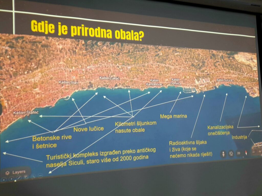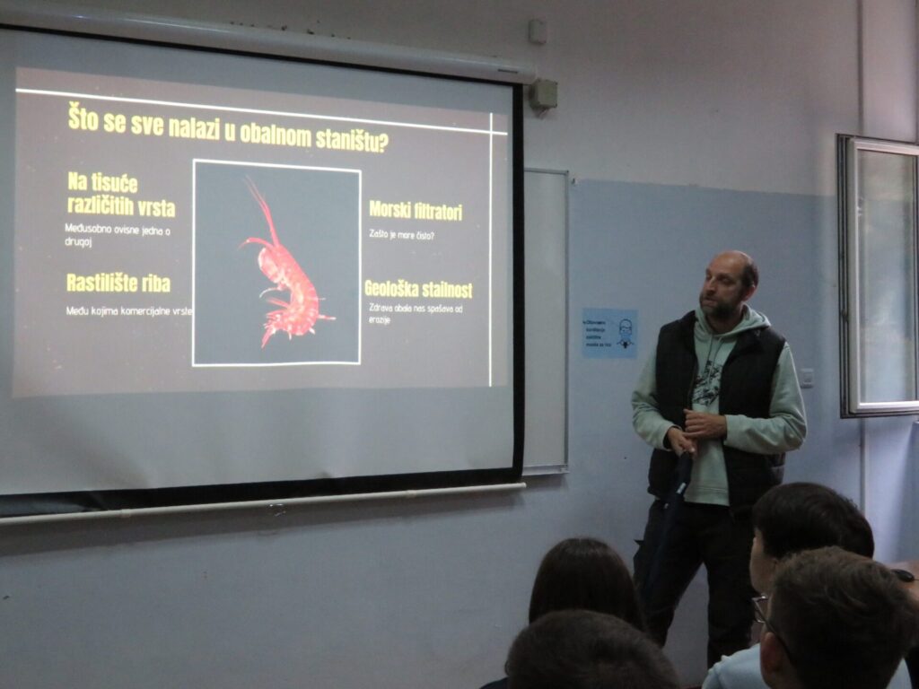 Tema predavanja bila je da gospodin Ugarković kroz dva dijela suoči učenike sa štetnim ljudskim djelovanjem na obali i u morskom okolišu te ih educira o posljedicama po organizme u svijetu bodljikaša, glavonožaca, školjkaša, puževa, mnogočetinaša, virnjaka, stražnjoškržnjaka, riba i drugih morskih organizama, prvenstveno u zoni litorala. Već na samom početku učenici su putem karte gosta, izrađene posebno za ovo predavanje, mogli istražiti stanje obale te dugogodišnja štetna djelovanja u Kaštelanskom zaljevu kao njihovom najbližem školskom morskom okruženju u kojem i sami djeluju. Uz prikazana područja betonskih riva i šetnica, novih lučica, kilometara šljunkom nasute obale i mega marine, zabrinjavajuće je što je prirodna obala na sjevernoj strani zaljeva ostala samo na području od Resnika do Pantane. Mnogi ljudi još nisu svjesni kakve su posljedice za živi svijet mora zbog toga, a dodamo li utjecaj kanalizacijskih onečišćenja, industrije, radioaktivne šljake i žive (koje se nećemo nikada riješiti) za Kaštelanski zaljev, jednostavno se može zaključiti da se priroda i morski svijet nepovratno uništavaju.