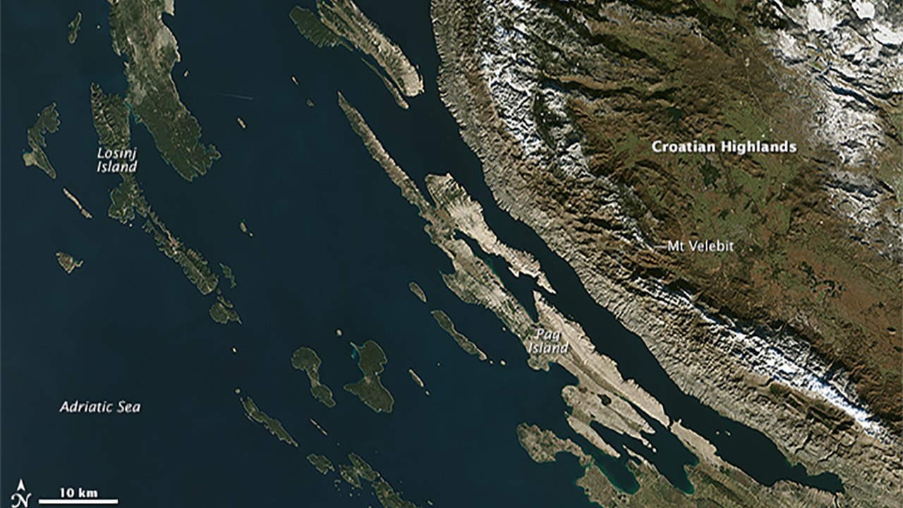 Na stranicama Earthobservatoryja autor teksta piše da “dinarske Alpe” slijede dugu hrvatsku obalu Jadrana poput izvinute kralježnice. Ovaj visoki lanac s vrhuncima koji dosežu i do 1831 metar te s golim obroncima predstavlja dramatičnu pozadinu obalnih turističkih odredišta.