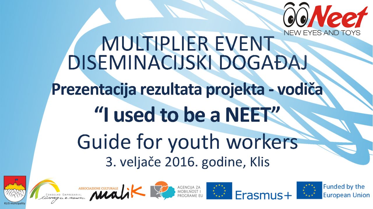 Danas, 3.veljače 2016. u Klisu, Dom kulture Jozo Buliga u 10 h održat će se predstavljanje vodiča za rad s mladima ”I used to be a NEET”, rezultata projekta nositelja Općine Klis koji se provodi u strateškom partnerstvu sa udrugama Malik iz Italije i CETS iz Portugala, financiranog 100% sredstvima programa Erasmus+ (u iznosu 98.110,00 €).